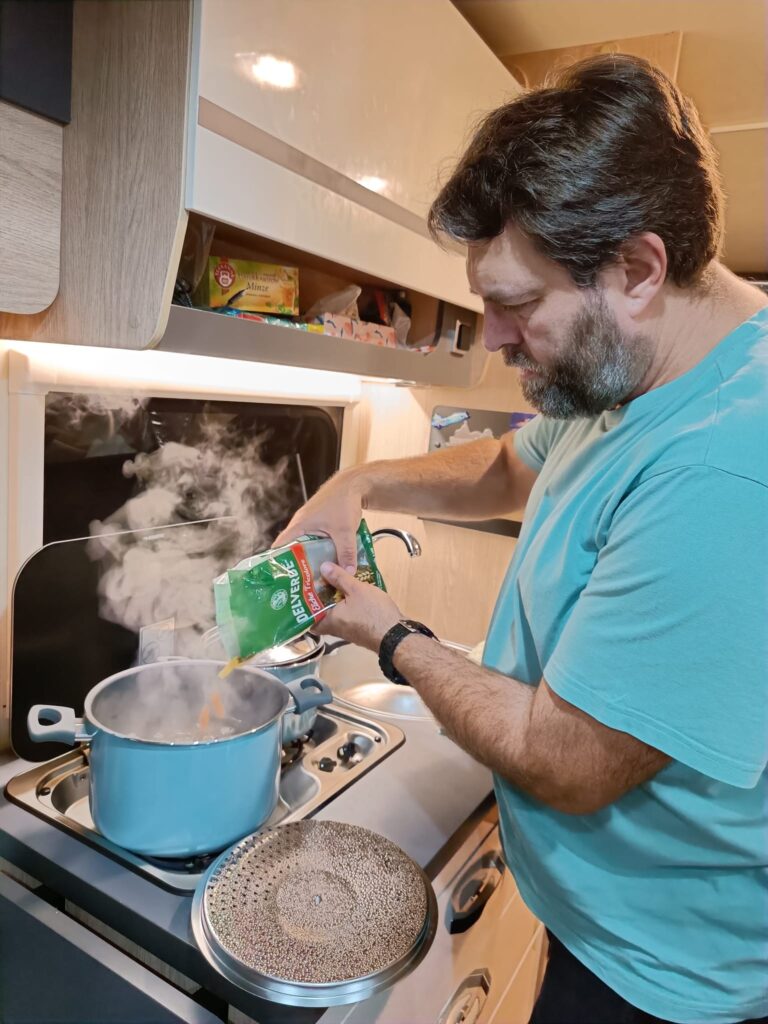Und dann war es auch soweit: Das erste mal kochen im Wohnmobil! Ja, wir machten in diesem Urlaub alles zum ersten mal.